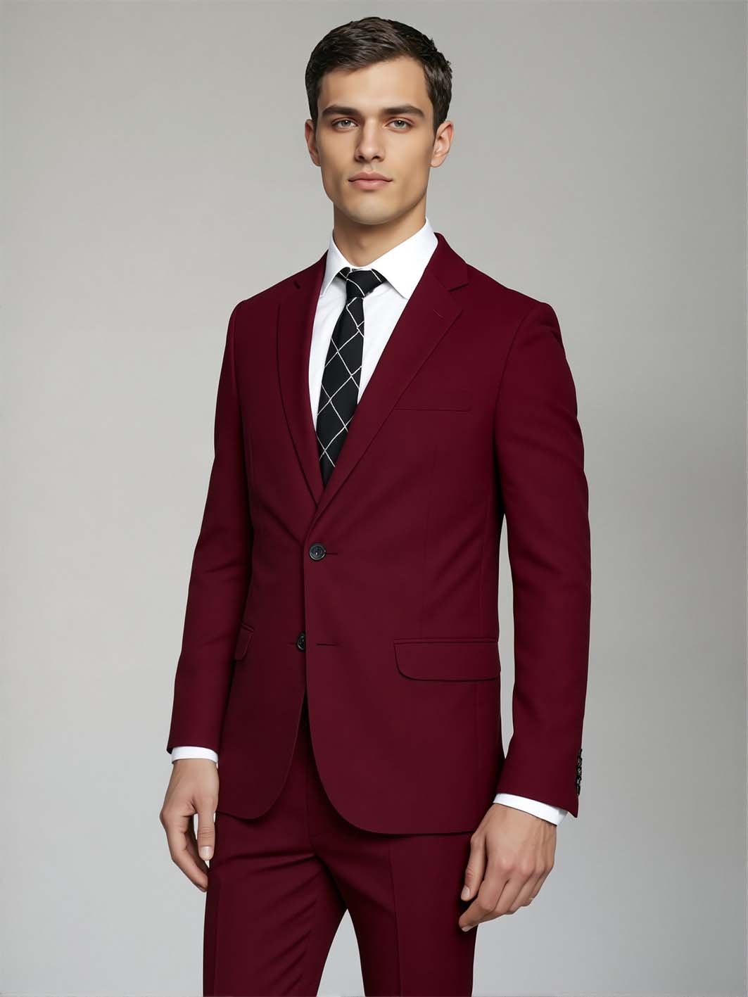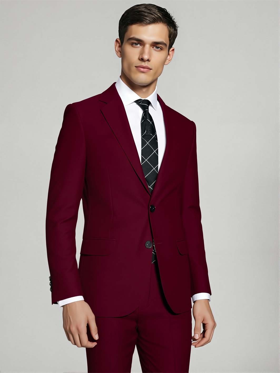 Destaca con elegancia y comodidad en este sofisticado ambo en tono bordo, confeccionado en tela tropical mecánico, perfecto para el caballero contemporáneo que busca un look distintivo y confortable en cualquier ocasión.