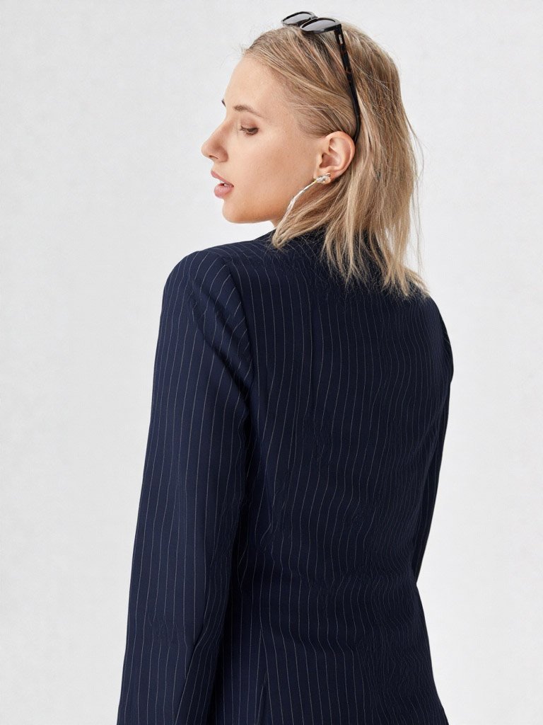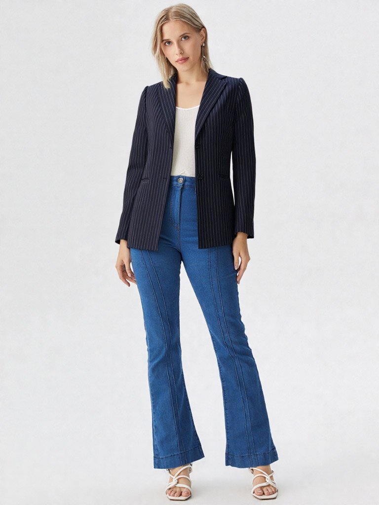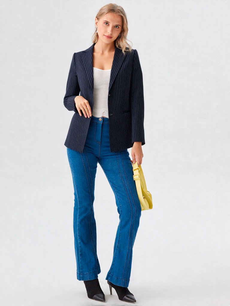El azul marino profundo con finas líneas verticales no solo es un estándar de la elegancia, sino que visualmente estiliza y alarga la figura, mientras que el corte oversize aporta ese aire contemporáneo y relajado que define a las mujeres líderes de hoy.
