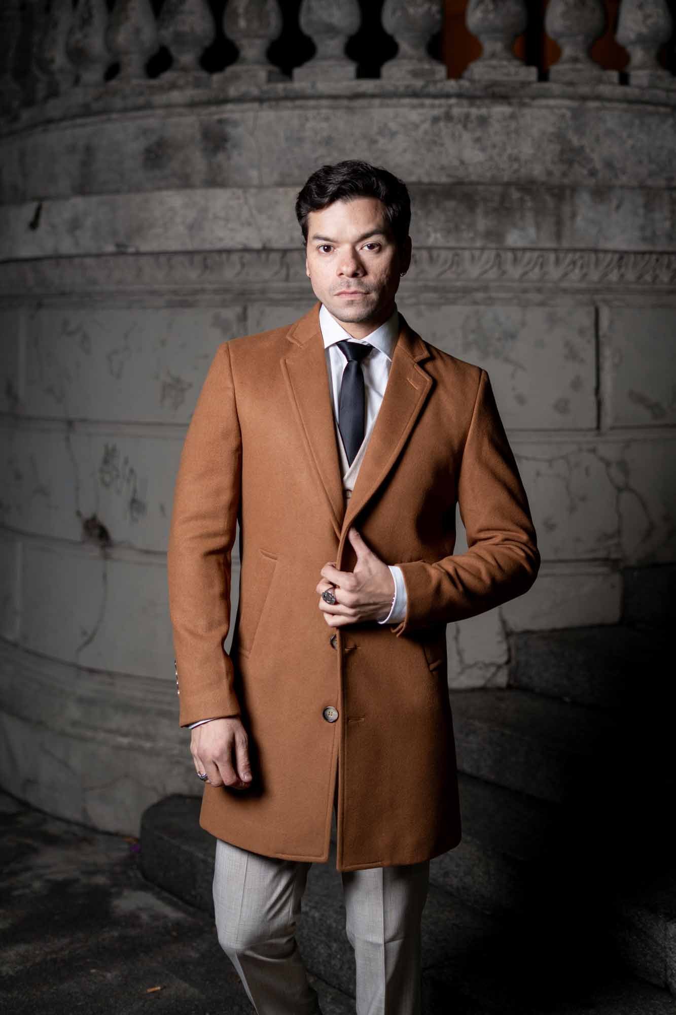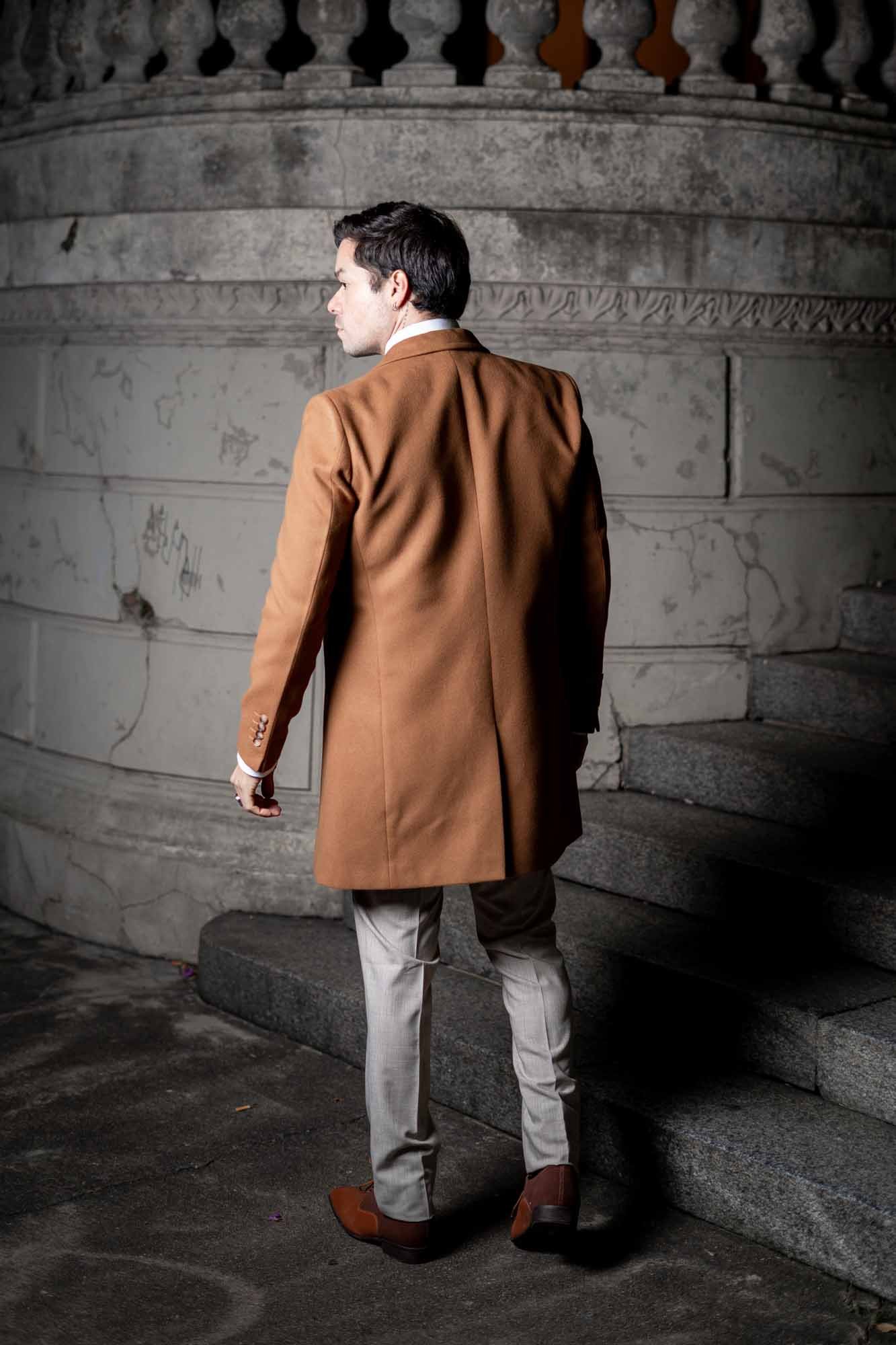 Eleva tu estilo invernal con este sofisticado tapado de vestir para hombre en tono camel, la prenda esencial para el caballero moderno que busca distinción y protección con máxima elegancia durante la temporada fría.
