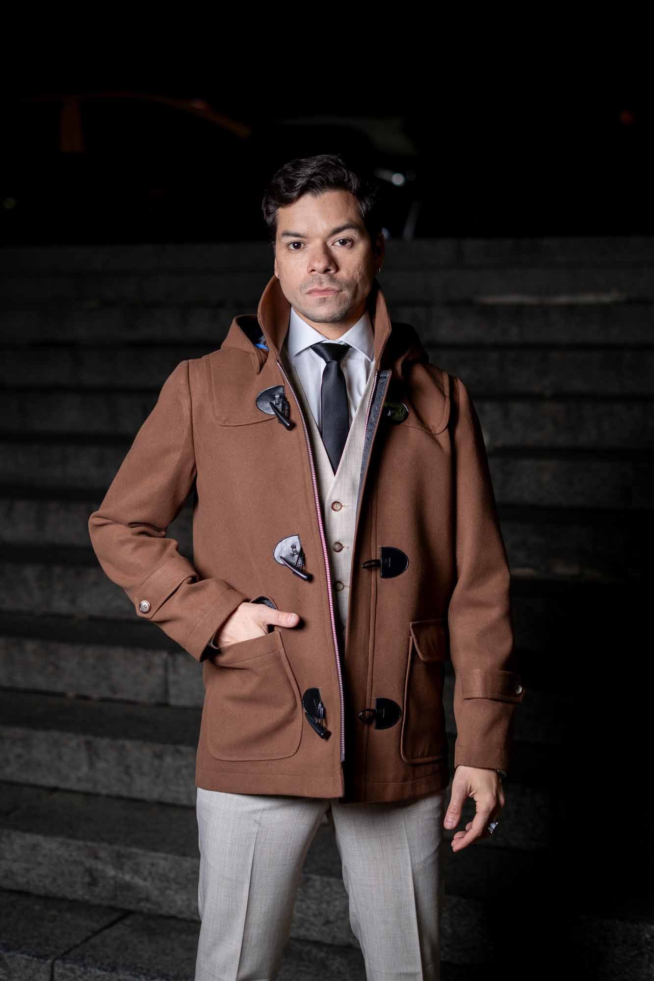 Detalles de Confección: Bolsillos laterales amplios tipo parche con solapa, hombros estructurados, cuello elevado y costuras de precisión que aseguran una silueta impecable. El diseño robusto permite llevar trajes o atuendos casuales debajo con total comodidad.
