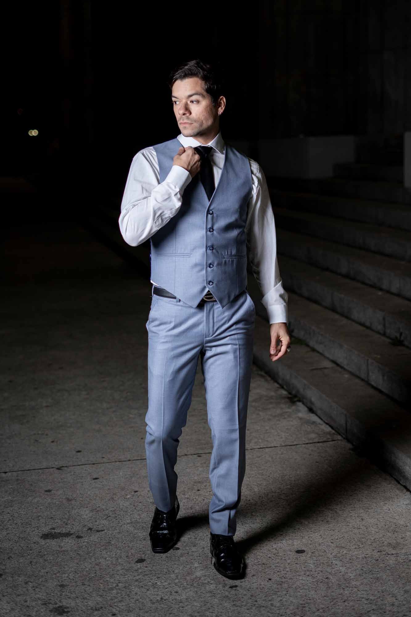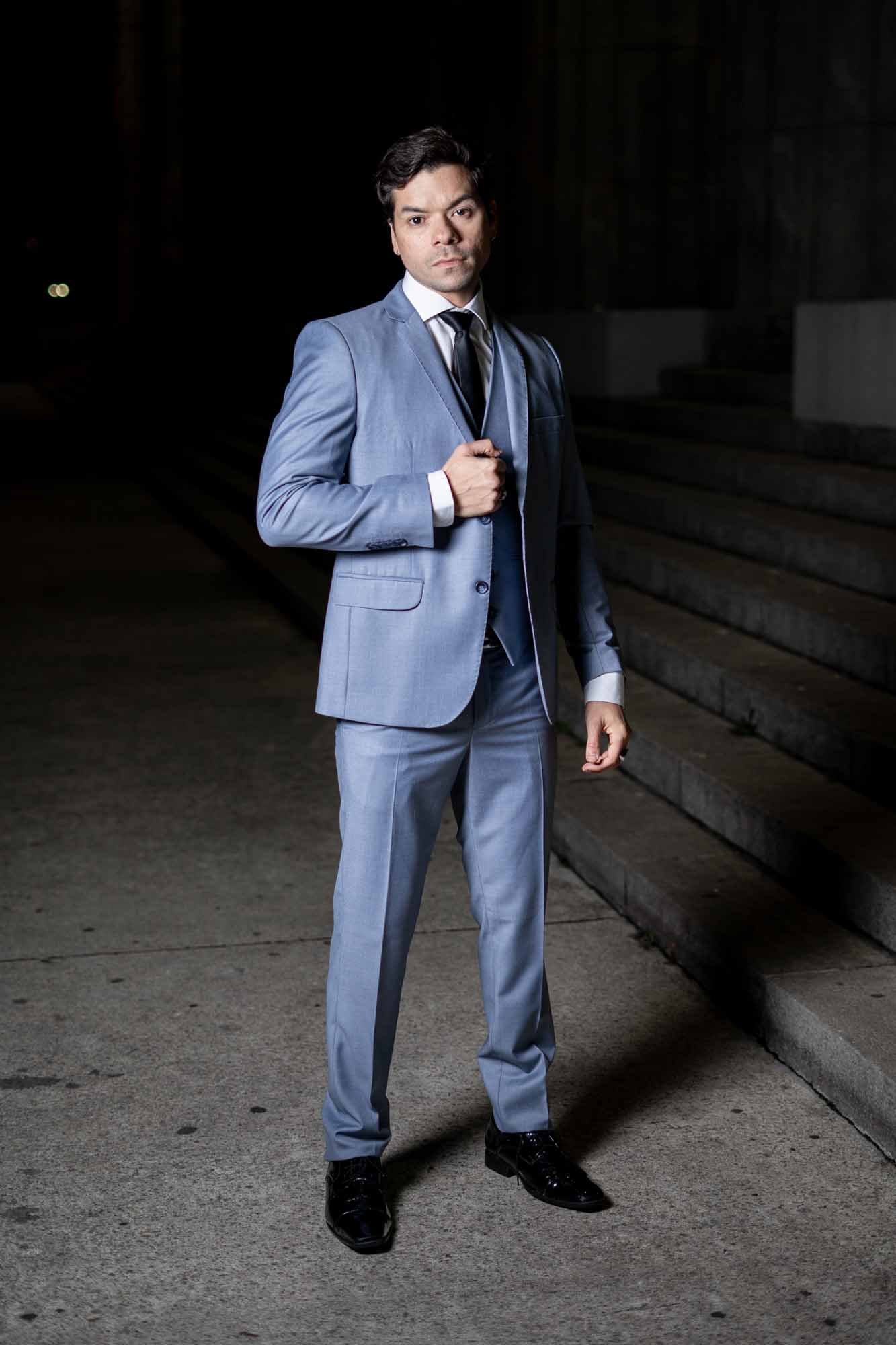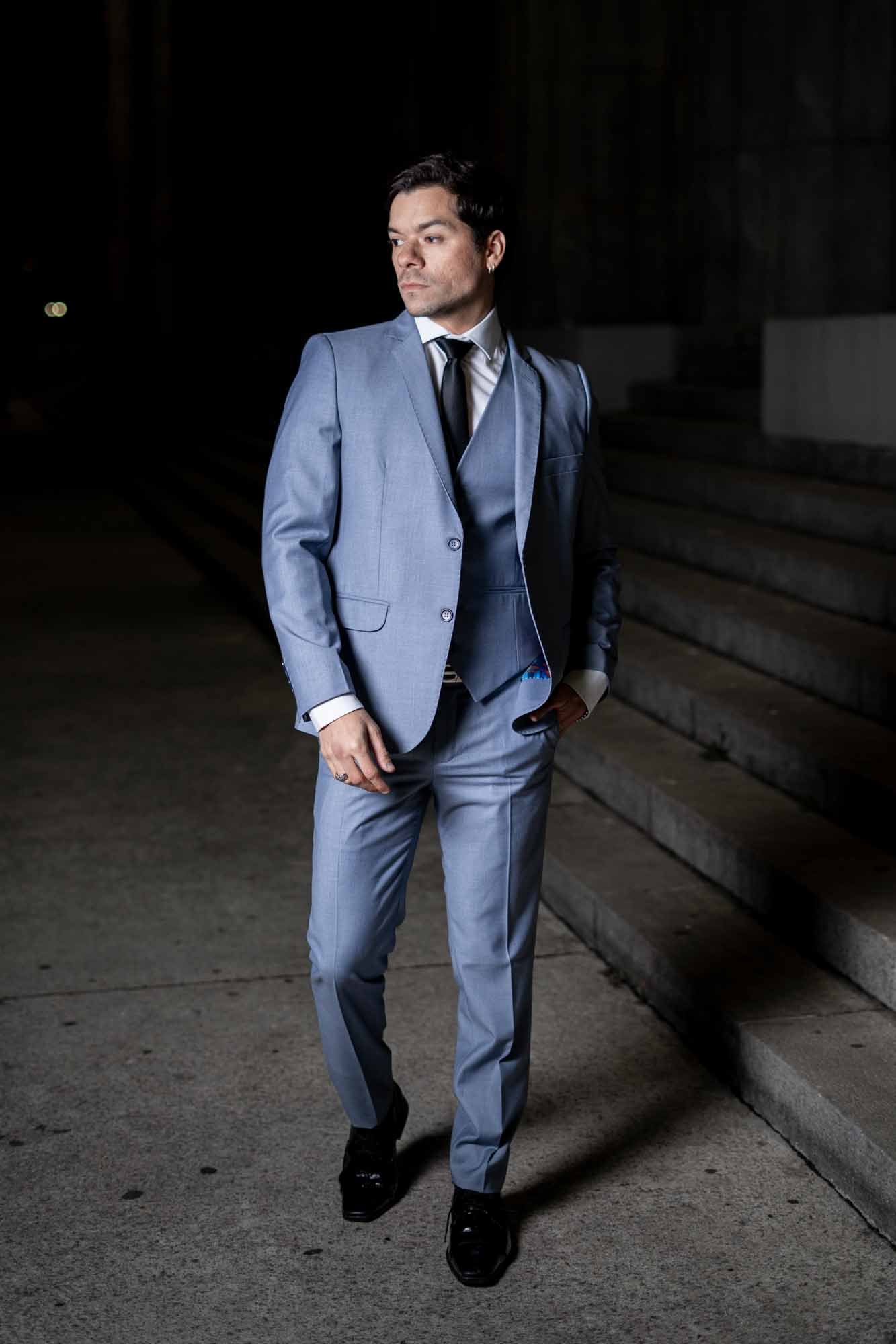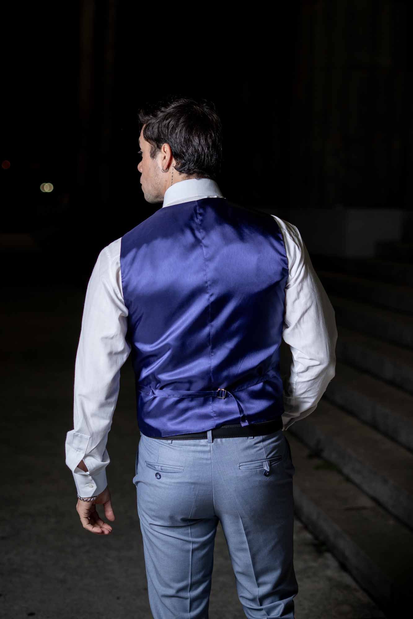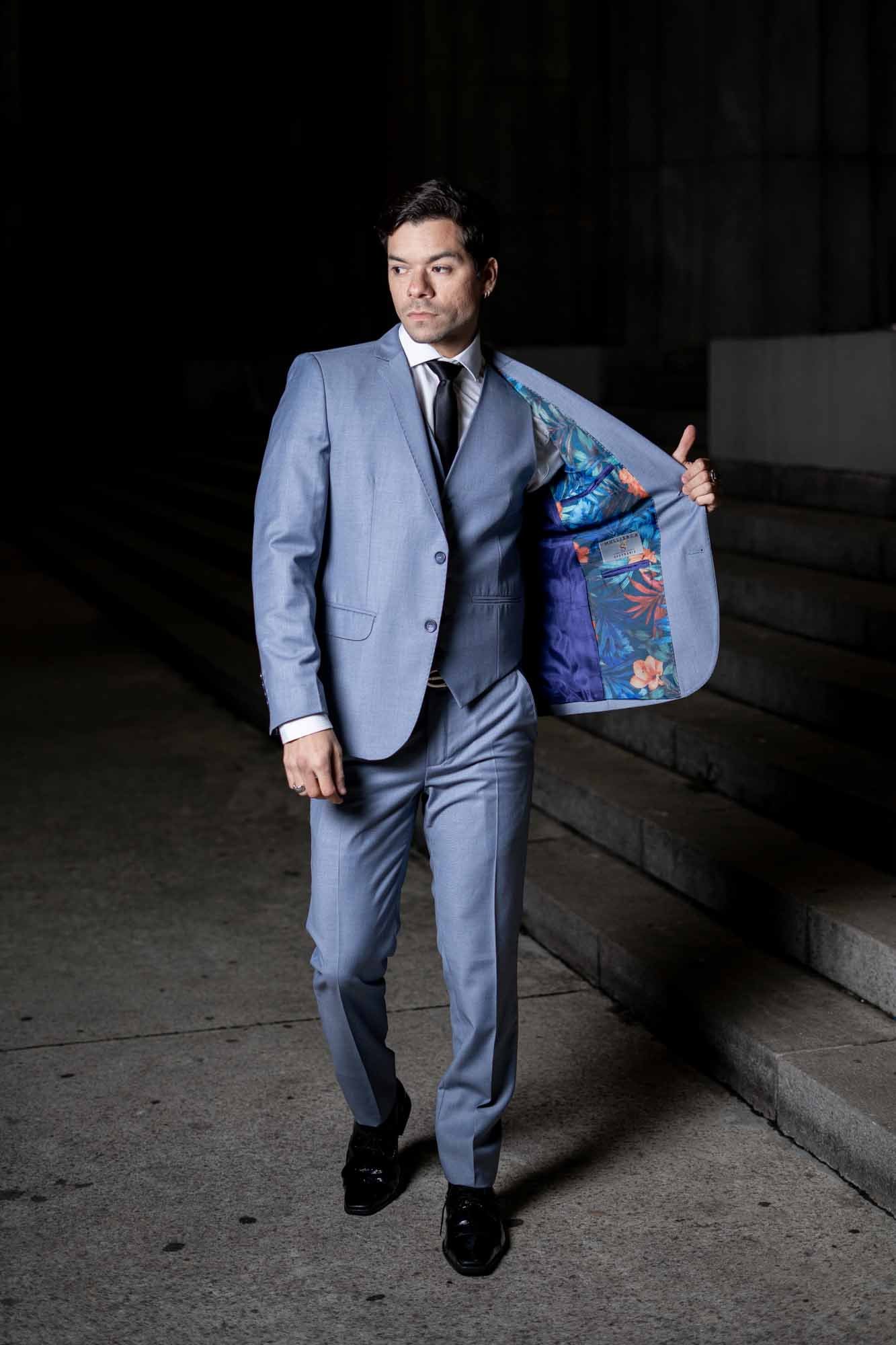 Desde el diseño innovador hasta la selección meticulosa de materiales, cada pieza de este traje está pensada para destacar. La tela, disponible en opciones lisas o con un microtejido sutil, añade profundidad y textura al color, sin abrumar. La chaqueta, con solapas de muesca, presenta un corte contemporáneo que complementa el chaleco incluido, destacando la formalidad del conjunto. Por último, el pantalón, confeccionado con un corte ajustado, asegura un ajuste perfecto que se adecúa a las proporciones de cada usuario.