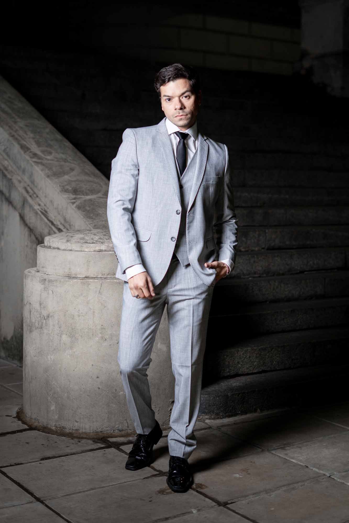 Descubre la elegancia refinada con este espectacular traje de tres piezas en tono gris claro, una prenda imprescindible para el caballero moderno que busca distinguirse en cualquier ocasión especial.
