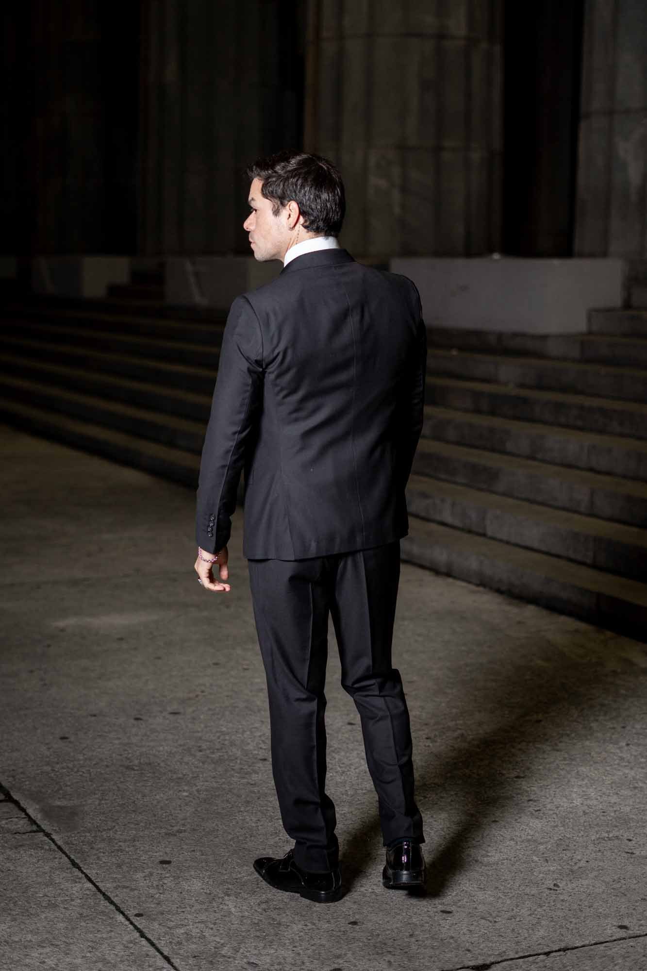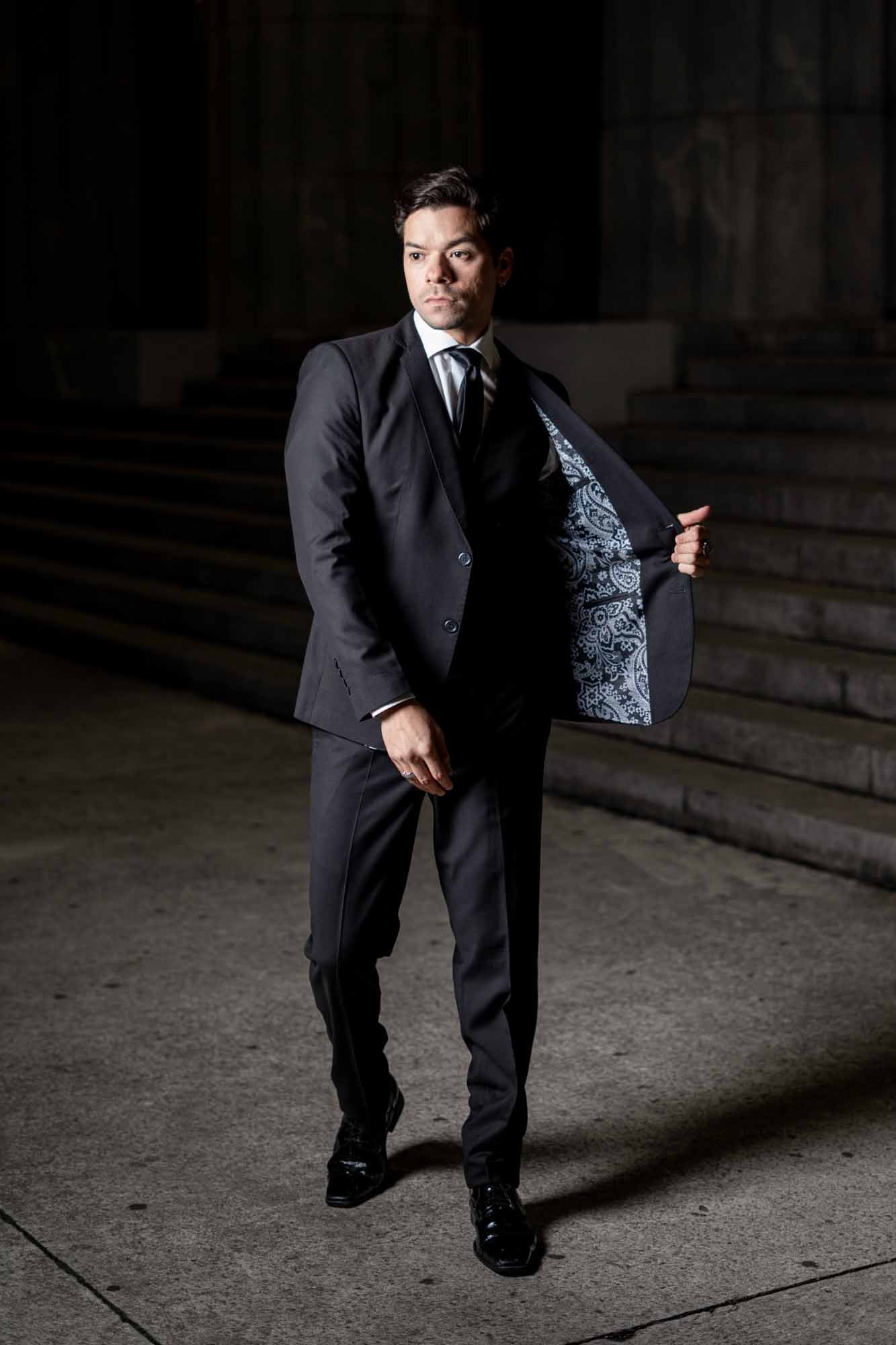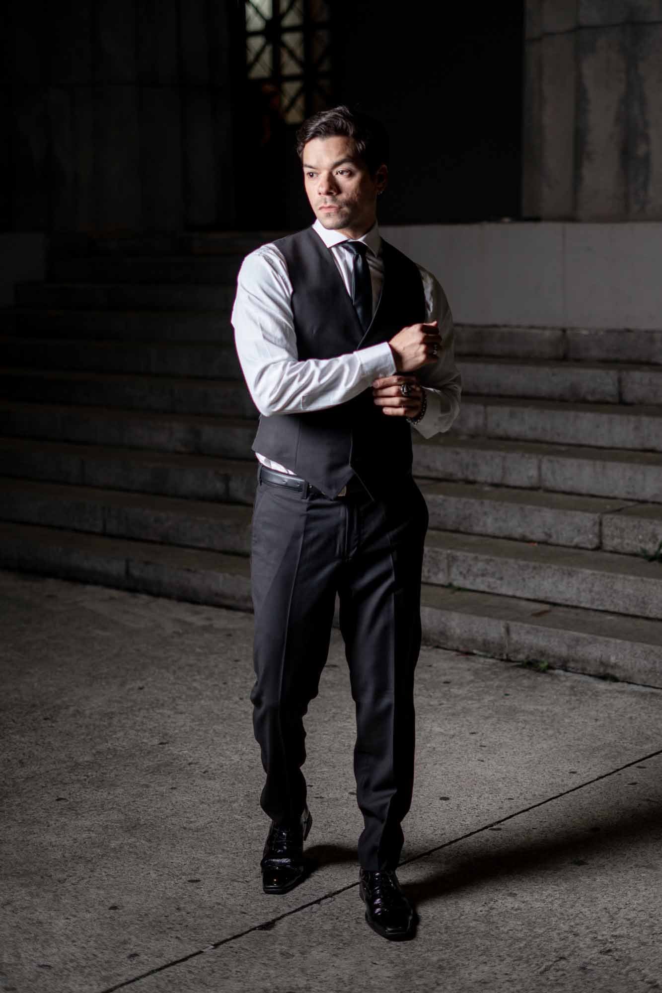 El color negro azabache del traje aporta una profundidad y elegancia sin igual, convirtiéndolo en un referente de máxima formalidad. Su textura, lisa o con un microtejido apenas perceptible, le garantiza versatilidad para adaptarse a diferentes estilos y preferencias. Incluye un saco de corte sartorial con solapas de muesca que define una línea moderna y atemporal, mientras que el chaleco suma puntos de exclusividad y refinamiento. El pantalón, de corte recto, completa el conjunto con equilibrio y sobriedad, ideal para quienes buscan una silueta definida y una presentación impecable.