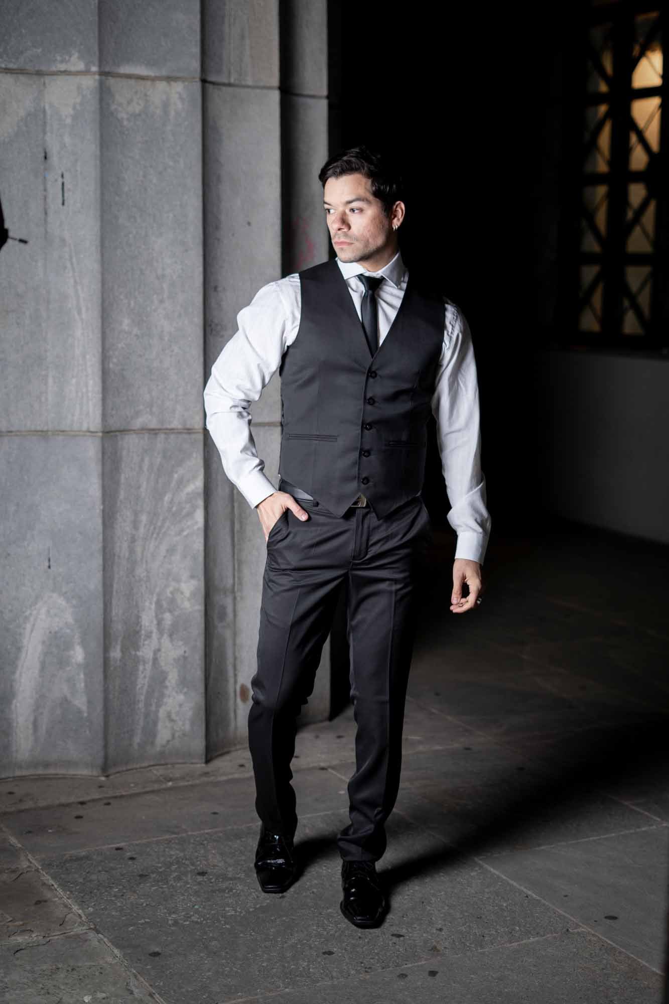 El conjunto incluye un saco de corte sartorial con solapas de muesca que resaltan la silueta de forma refinada, junto con un pantalón de corte recto que asegura un ajuste cómodo y un pulcro chaleco que combina perfectamente. Esta combinación asegura que te sientas tan bien como luces al usarlo. Cada detalle ha sido cuidadosamente diseñado para garantizar que te muevas con facilidad mientras mantienes un aura de distinción.