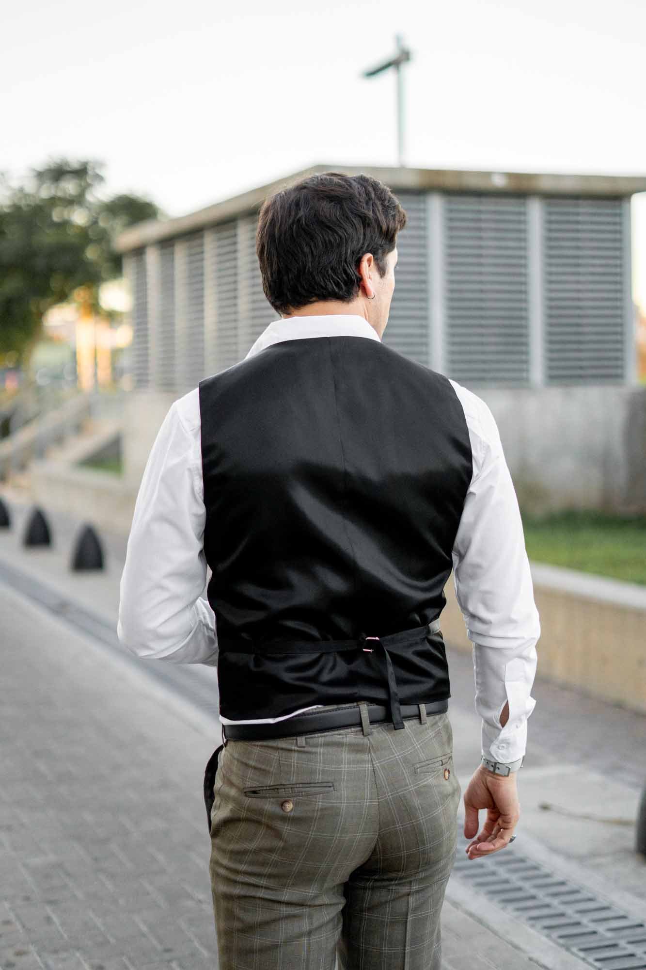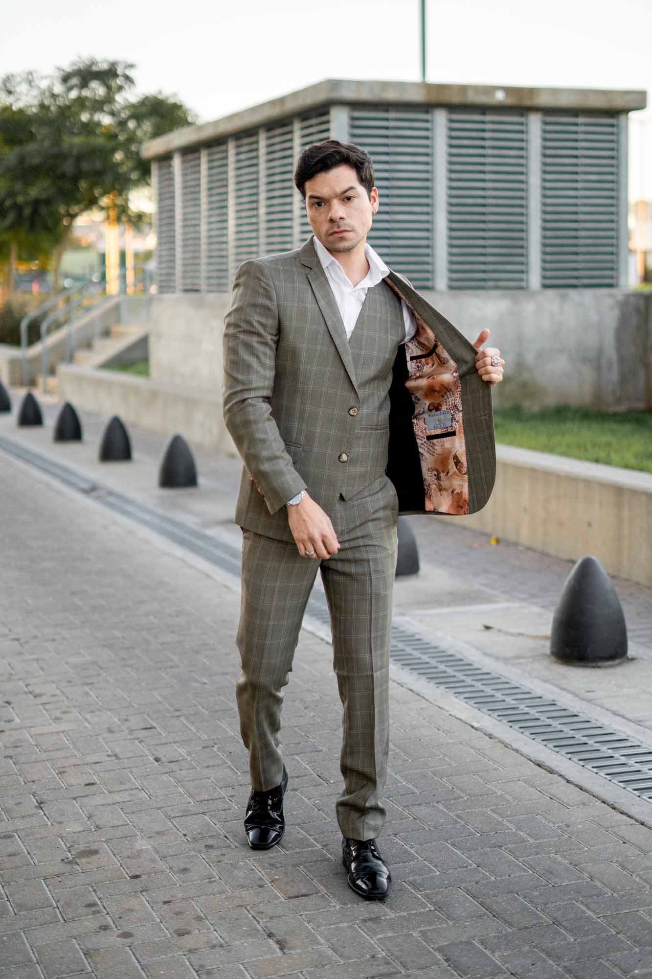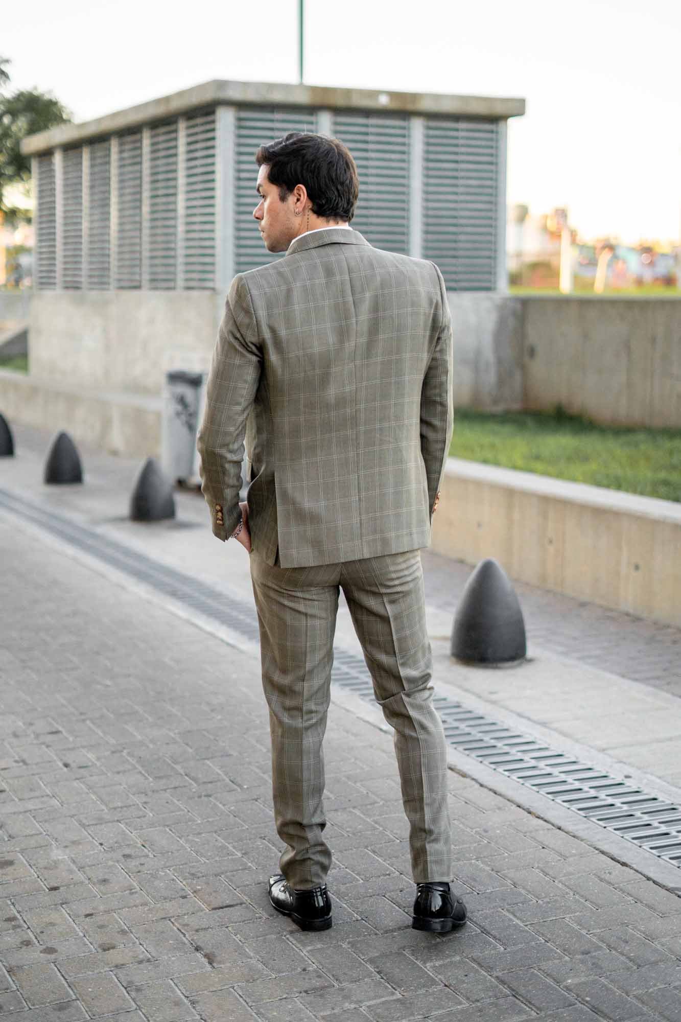 La tela de tonalidad neutra, disponible en gris verdoso o marrón topo, se complementa con un patrón de cuadros sutil que agrega textura y profundidad visual al conjunto. El saco presenta solapas de muesca y está diseñado para ofrecer un ajuste favorecedor que resalta la silueta masculina. El chaleco aporta una capa adicional de elegancia, mientras que el pantalón de corte recto completa el look con estilo impecable. Cada detalle ha sido cuidadosamente pensado para ofrecer una experiencia de uso excepcional.